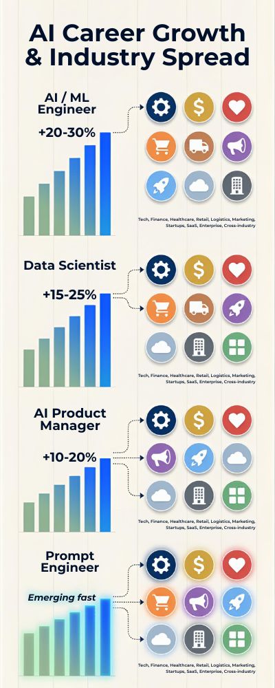| AI / ML Engineer | +20–30% | Tech, Finance, Healthcare |