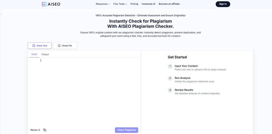 AISEO Plagiarism Checker is a tool for content creators to ensure the integrity of their work before publishing it on the web. It analyzes the text against millions of web pages and documents to detect similar phrases or duplicate content. Use it by copying the content into the box and checking if there’s anything that sounds suspiciously familiar.