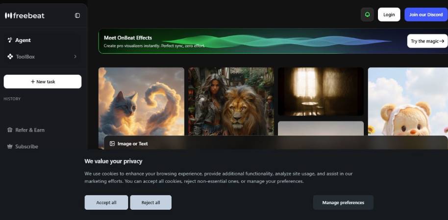 Freebeat is an AI video maker primarily focused on creating video content from audio or music. Rather than slicing up clips yourself, you can either upload a track or have the AI create a video based on your text, with the AI-designed scenes adapting to the beat, tempo, and feel of the music. It’s quite fast, almost a little too fast, and the video results are often cinematic in appearance for something so automated.